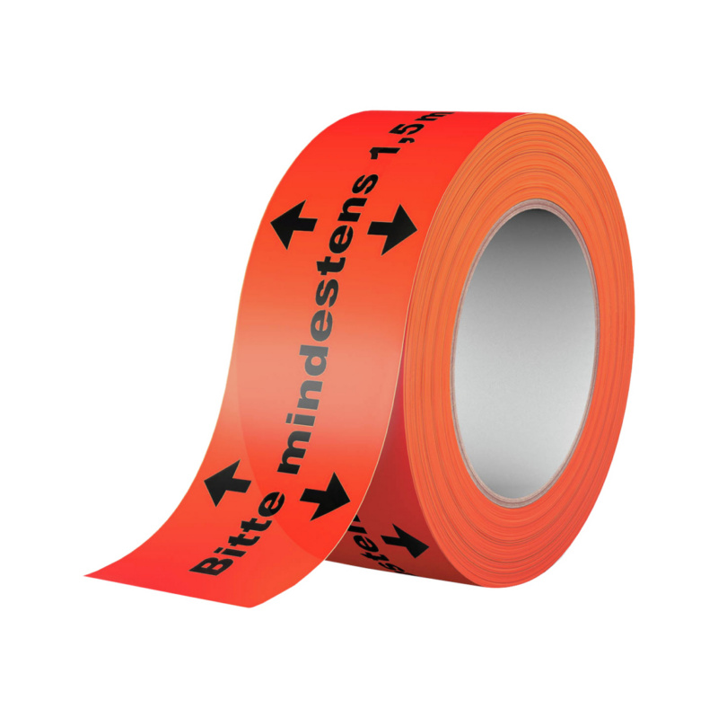PVC lipni juosta su natūralaus kaučiuko klijais su įspaudu „Prašome laikytis ne mažesnio kaip 1,5 m atstumo“.