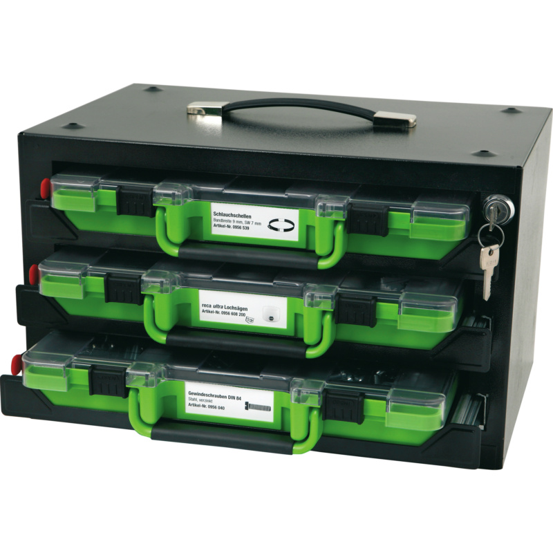 C tipo VTS metalinė dėžė yra padengta patvariu milteliniu dažymu ir suteikia vietos trims RECA VISO asortimento dėklams.