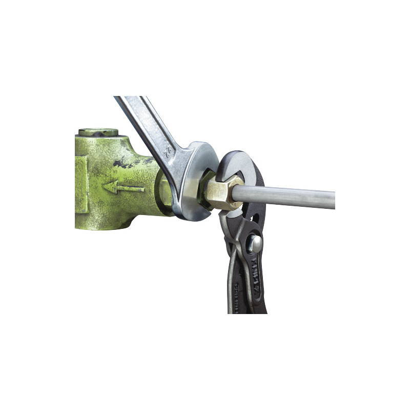Ergonomiškas rankenos dizainas ir neslystančiu plastiku padengtos rankenos patogiam darbui, ypač su didelėmis arba įstrigusiomis veržlėmis. Tikslus reguliavimas viena ranka tiesiai ant ruošinio vienu mygtuko paspaudimu, kad būtų galima optimaliai prisitaikyti prie įvairių ruošinio dydžių ir patogaus rankenos pločio. Chromo vanadžio elektrinis plienas, grūdintas.