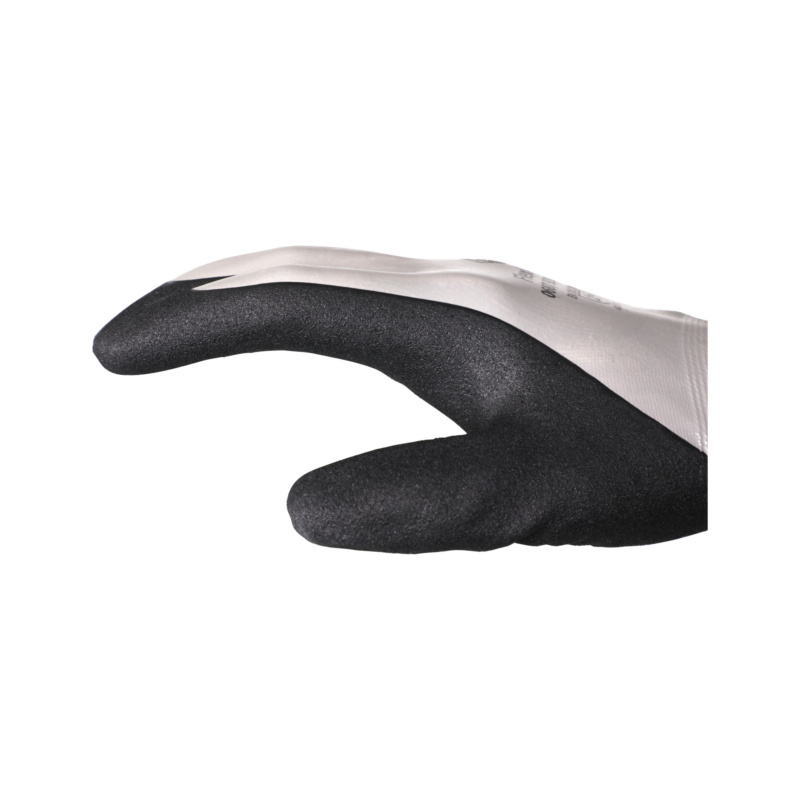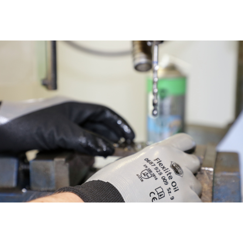 Flexlite Oil apsauginės pirštinės turi labai tvirtą dvigubą nitrilo dangą. Pagrindas yra lygus, tankus nitrilo sluoksnis, užtikrinantis reikiamą nepralaidumą ir repelento kokybę, reikalingą dirbant su aliejiniais skysčiais. Viršutinė danga yra patvari, neslidi nitrilo danga, užtikrinanti patikimą sukibimą su riebiais daiktais. Šios dvi dangos kartu su stabiliu poliamido pamušalu sukuria kokybišką, patogią ir lanksčią apsauginę pirštinę visoms užduotims, atliekamoms riebioje aplinkoje. EN 388:2016 – našumo lygis 4121X