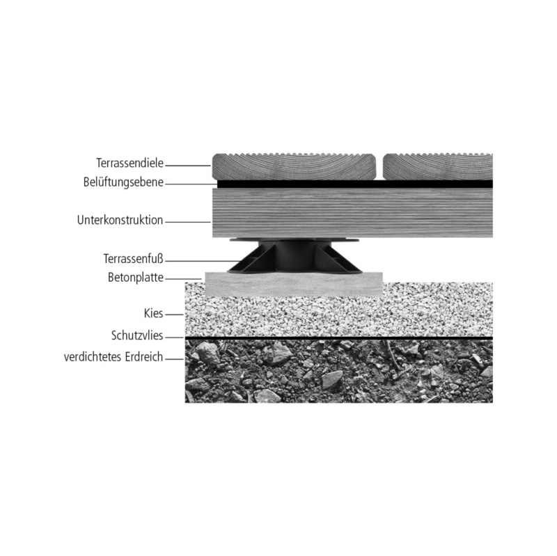 "Flisas išdėstomas taip, kad jis persidengtų, o tada padengiamas norima paviršiaus danga, pvz., žvyru arba antikapiliariniu sluoksniu / valcavimu. Kad po terasos konstrukcija neužmirktų vanduo, reikia atsižvelgti į bent 2° nuolydį. sąskaita“.